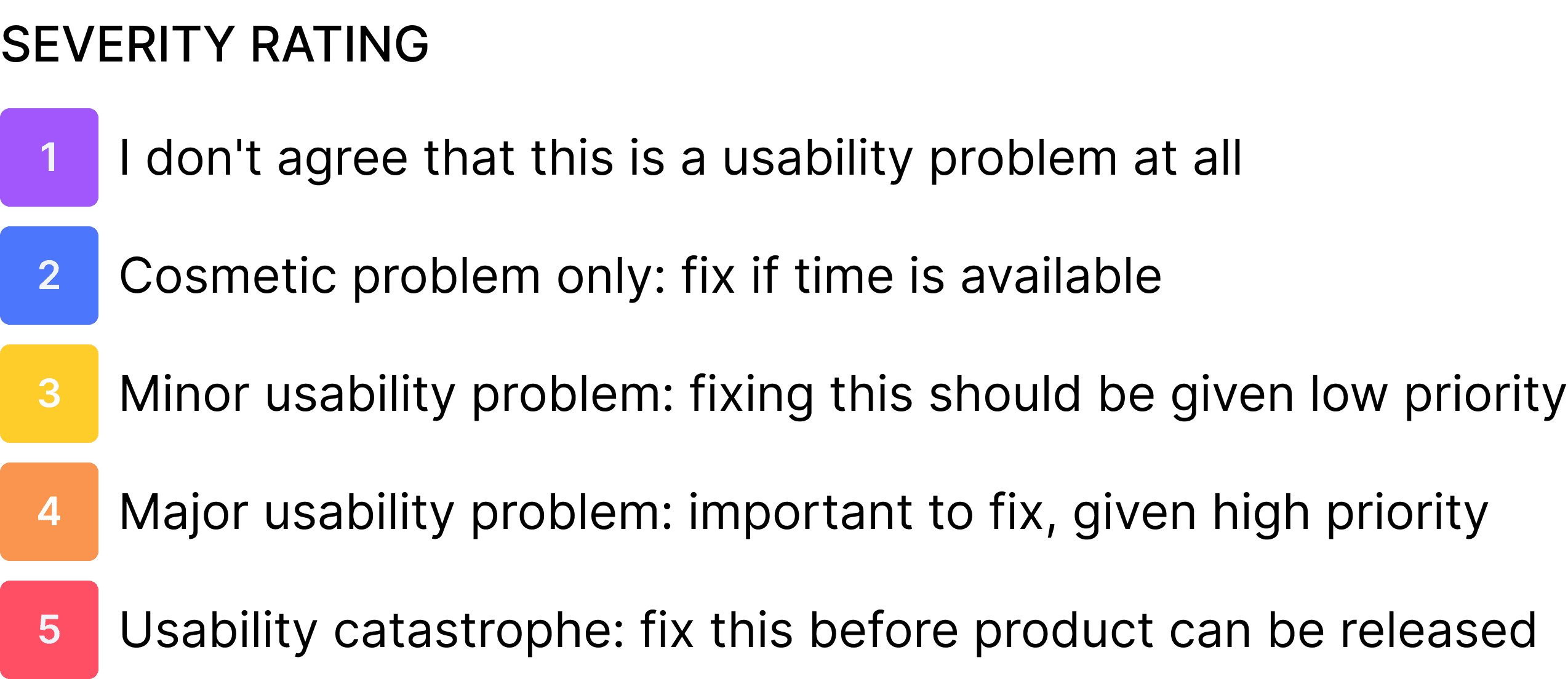 We performed a comprehensive audit of the original platform based on Jakob Nielsen's 10 Usability Heuristics. Each identified issue was then categorized using a 5 level severity rating to prioritize design efforts based on their impact on user success.