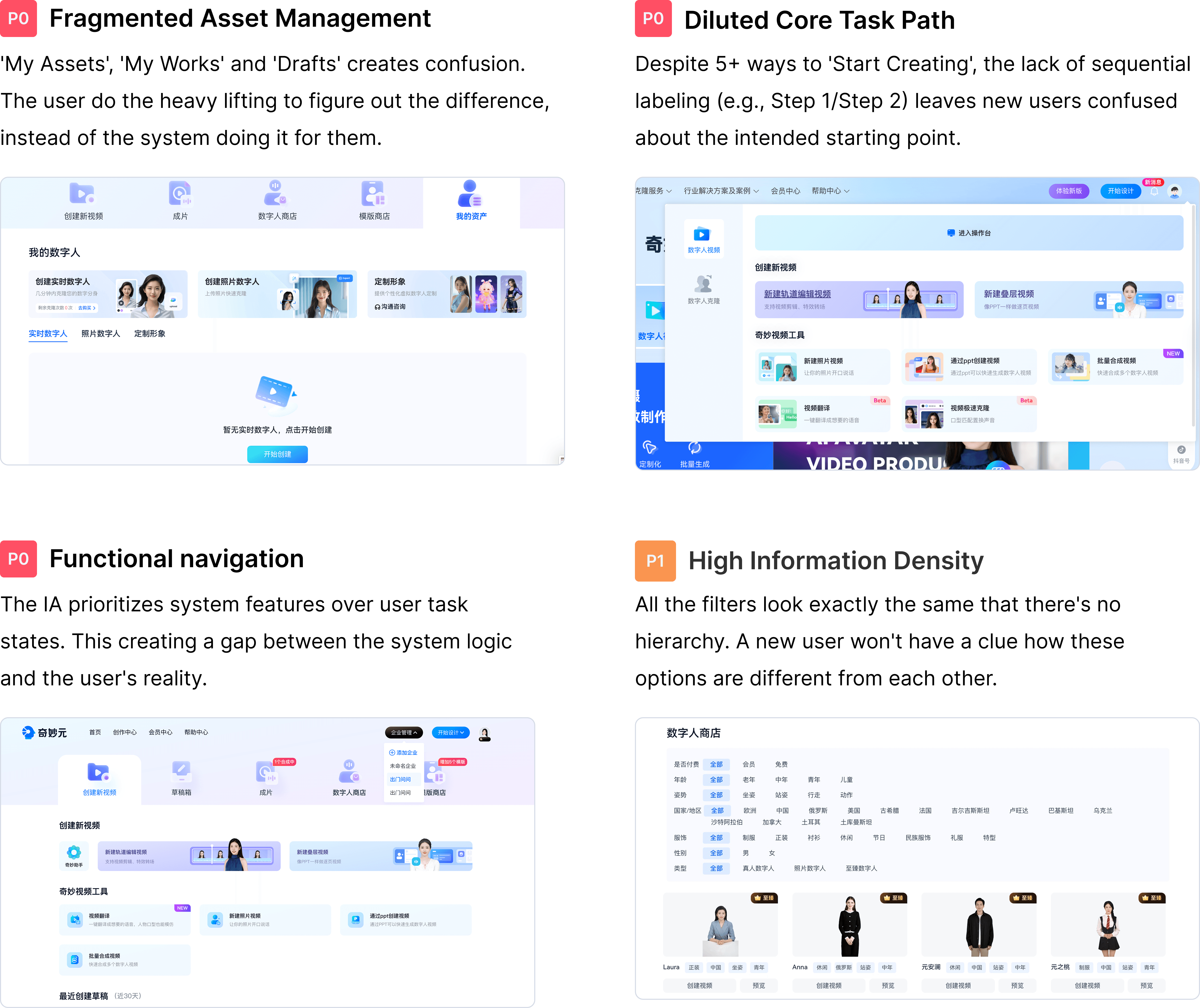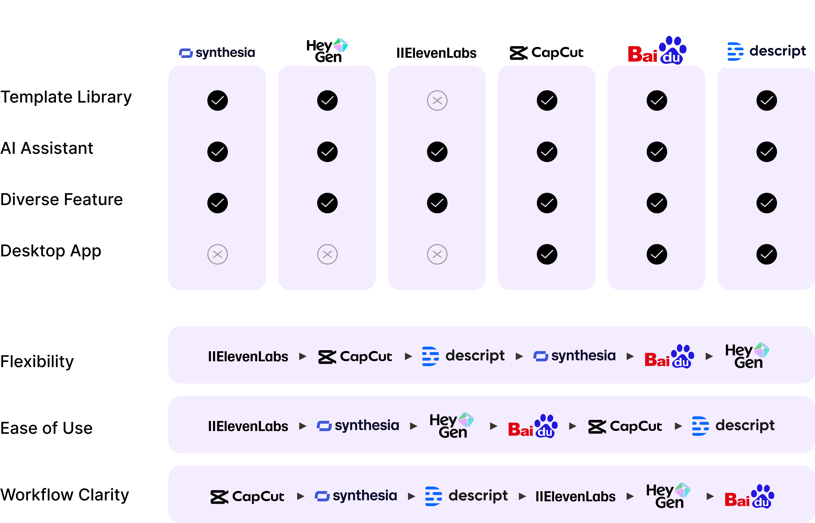 We evaluated 10+ industry products to identify emerging trends in AI video synthesis. To gain more actionable insights, we shortlisted 6 usable platforms for a deep dive analysis, focusing on their task flows and feature structures.